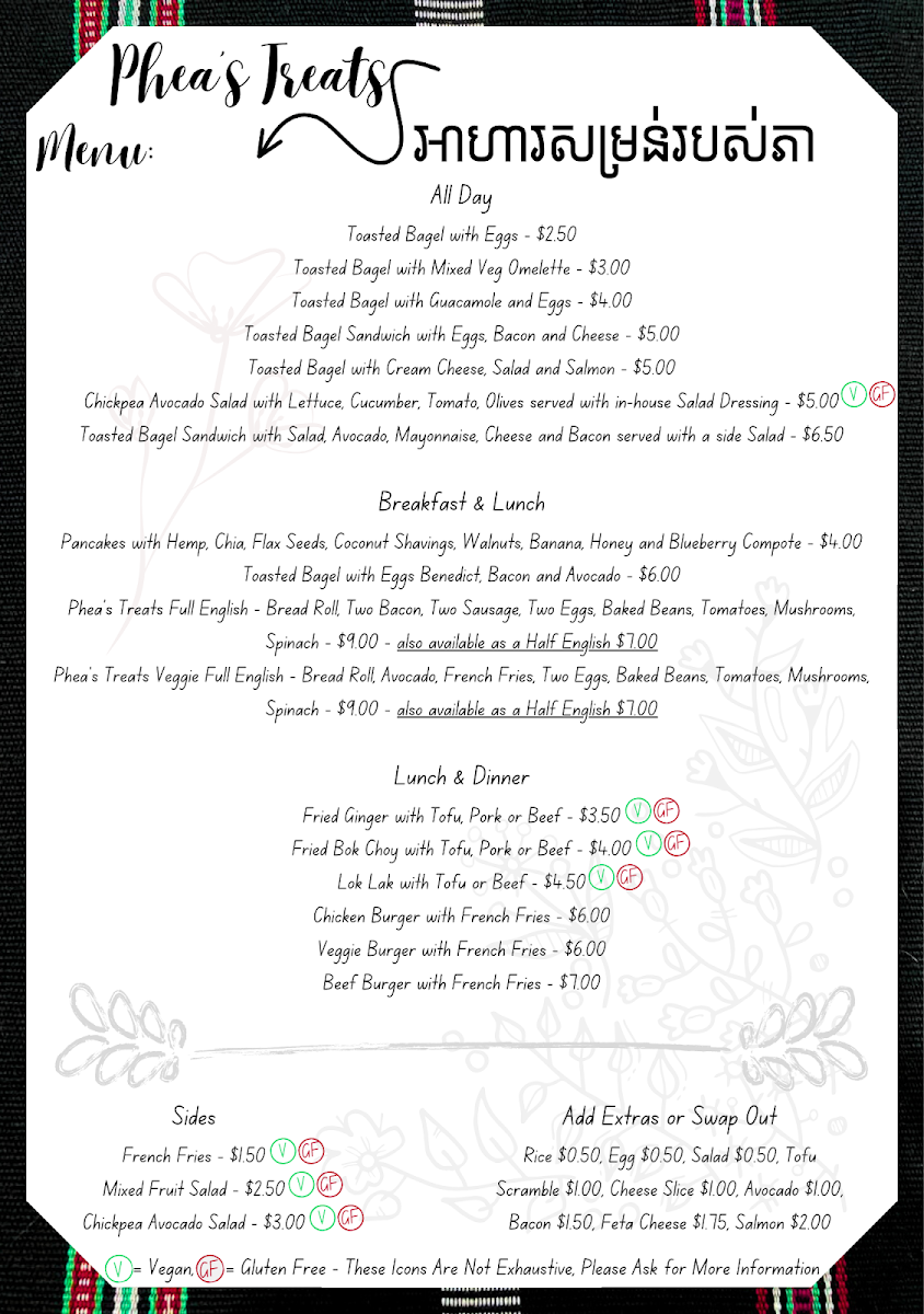 When it comes to the menu, Phea’s Treats offers a delightful array of Western-inspired dishes that cater to a variety of palates. From hearty vegan options to indulgent treats, there’s something for everyone. Indulge in their highly praised veggie burger, featuring a crispy bean patty that bursts with flavor, served alongside softly fried potatoes that remind you of home-cooked goodness. For those with a sweet tooth, don’t miss the exquisite cakes—Michelle Pierotti raves about the chocolate cake, banana bread, and pumpkin cake, all crafted with love and artistry. The husband-and-wife duo clearly knows how to blend flavors and create visually stunning desserts that taste as good as they look.